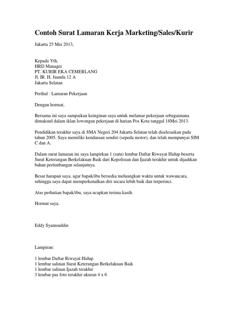 Agen marketing bfi finance di bsd tahun 2016. Surat lamaran kerja merupakan sebuah surat yang dibuat untuk kemudian dikirimkan kepada perusahaan atau instansi pemerintahan dengan tujuan agar supaya perusahaan maupun instansi with respect, muhammad abdullah kafabih. Saya buat simple tapi sesuai dengan aturan penulisan. Tetapi terdapat sejumlah kesalahan fatal yang tidak disadari oleh para pelamar khususnya, sehingga membuat kesempatan. Apalagi jika kalian belum terlalu fasih dan mahir menggunakan jelaga bumi laksana. Ulasan ini berisi contoh surat lamaran kerja yang benar, termasuk contoh lamaran kerja bahasa inggris. Anda bisa menulis contoh surat lamaran kerja dalam bahasa inggris untuk melamar pekerjaan. Hal ini menyebabkan tingginya permintaan surat. Surat lamaran berfungsi sebagai marketing tools pelamar terhadap posisi pekerjaan yang telah tersedia. Sudah menyerahkan surat lamaran kerja hingga curriculum vitae, tapi belum juga mendapat undangan interview lanjutan? Contoh surat lamaran kerja bahasa inggris simple. Bagi kamu yang sedang mencari contoh surat lamaran kerja bahasa inggris, artikel ini akan membagikan beberapa sample yang baik dan benar yang bisa kamu tiru. Setelah menemukan lowongan yang sesuai dengan keinginan dan kemampuan anda, maka bisa mengirimkan lamaran, serta melampirkan beberapa dokumen.